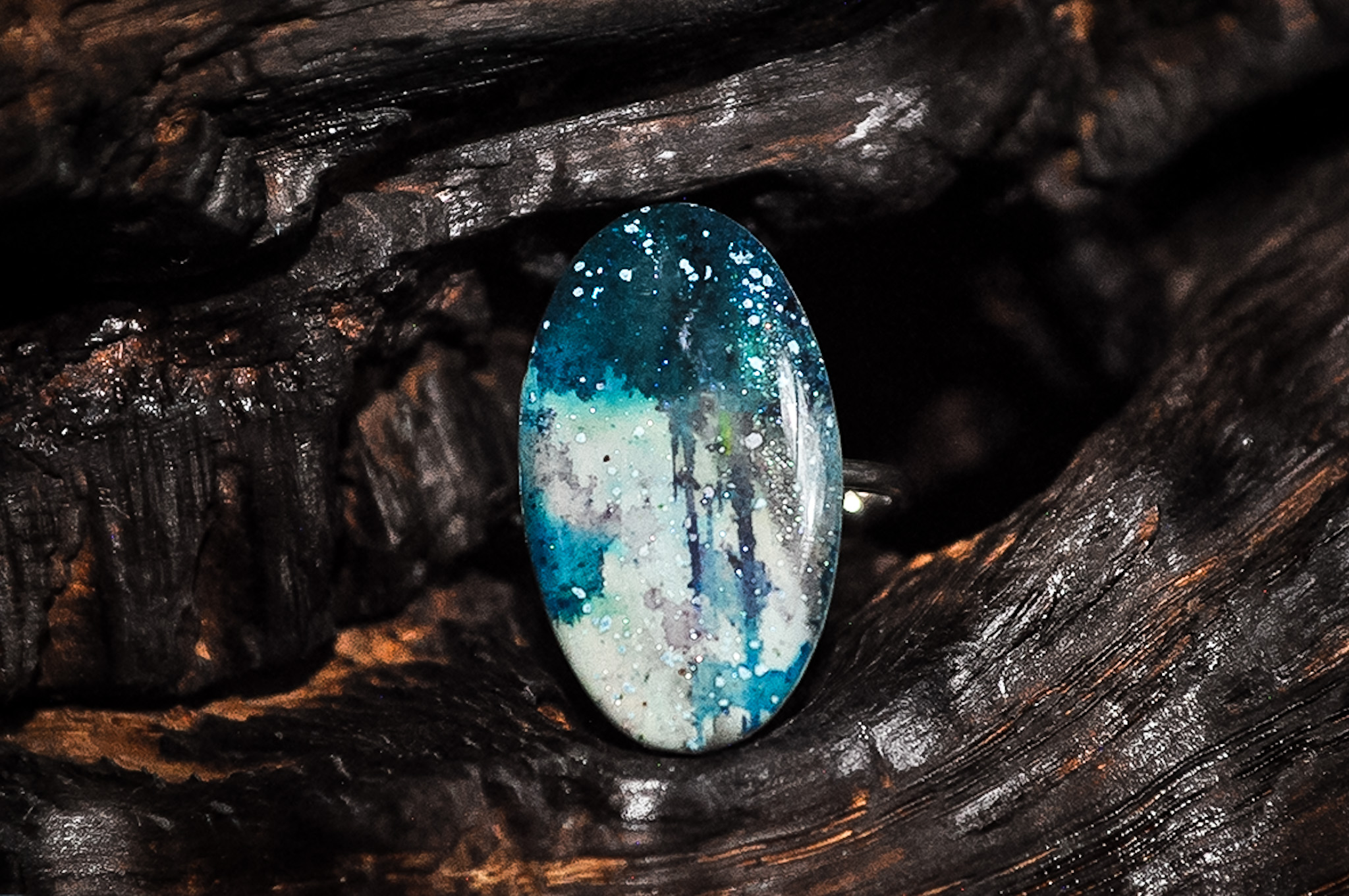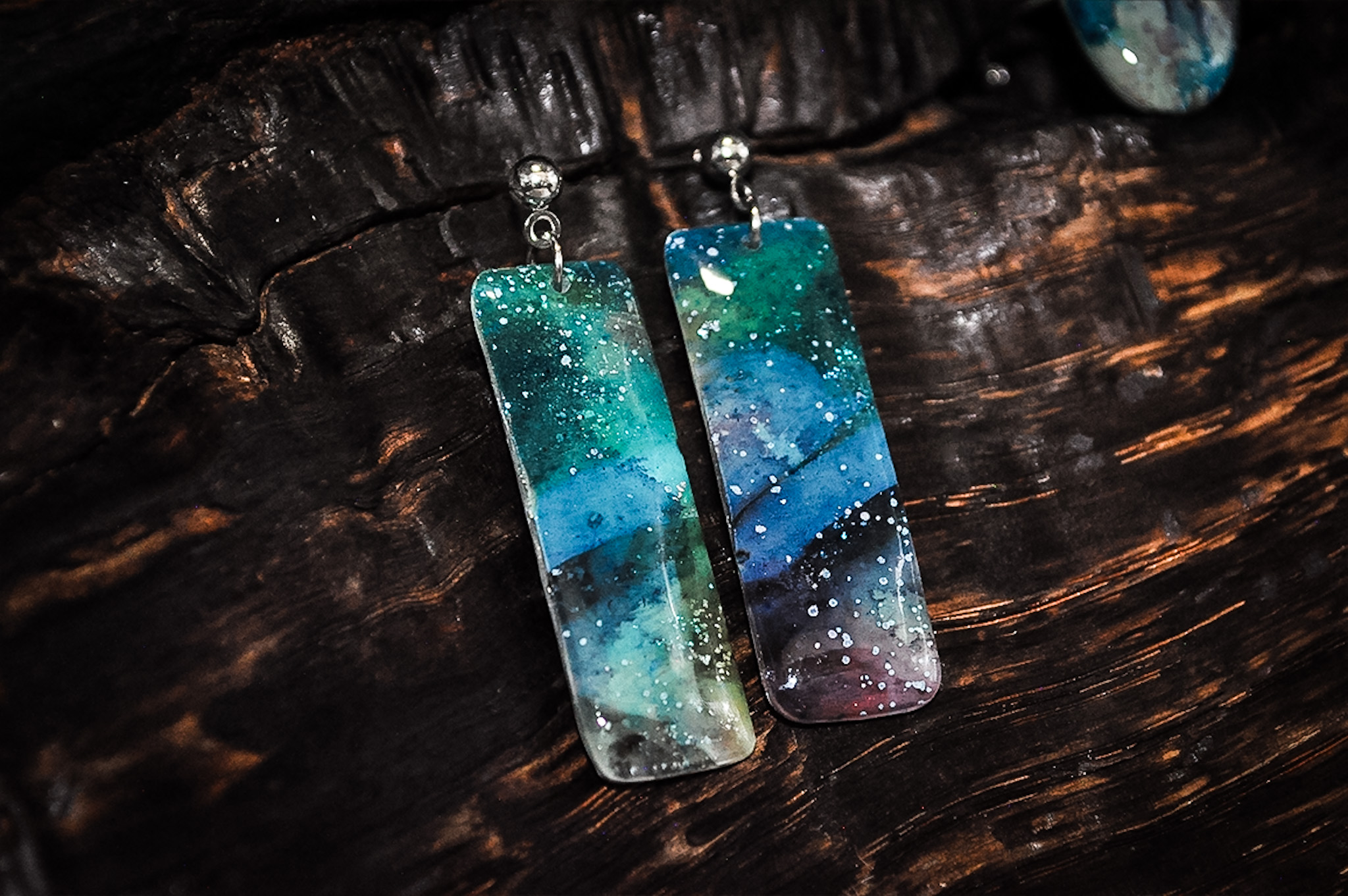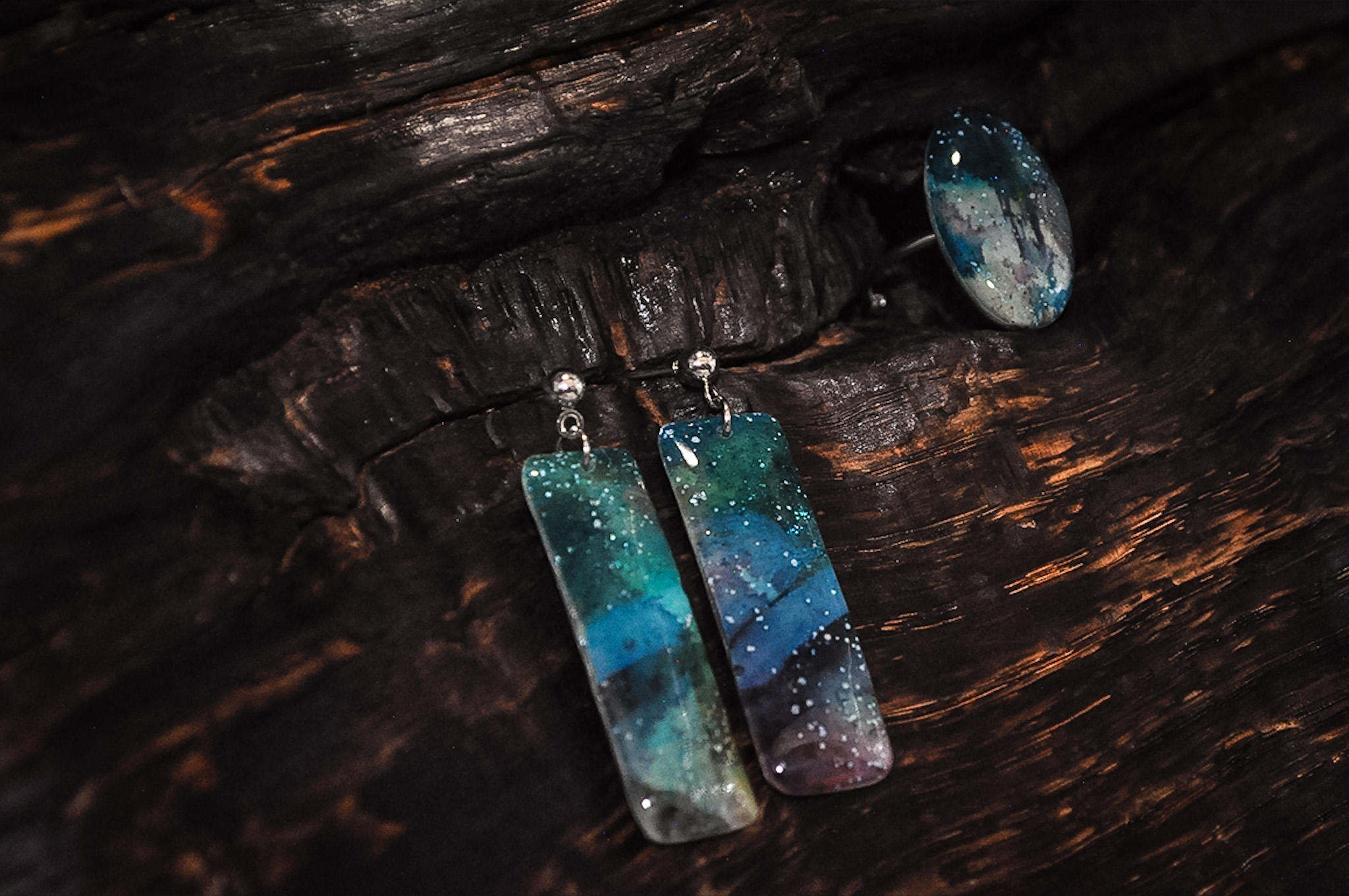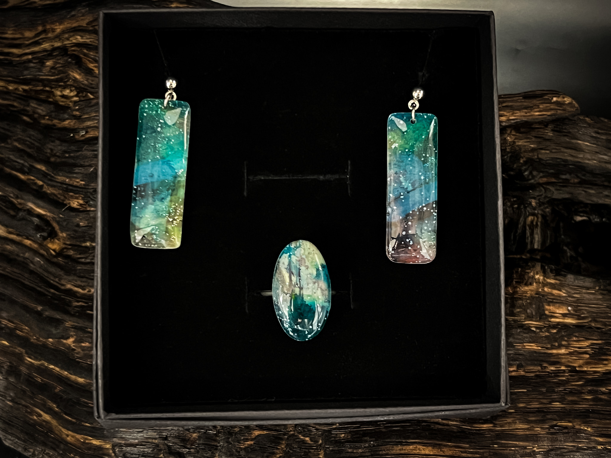 The Look: Bold, moody, and undeniably artistic. Each piece acts as a tiny canvas. The rectangular danglesprovide a long, elegant vertical drop that showcases the vertical “streaking” of the ink, while the oval ring serves as a focal point, capturing a swirling “vortex” of color on your hand. Because of the fluid nature of the process, no two sets are exactly alike—your set is a one-of-a-kind original.