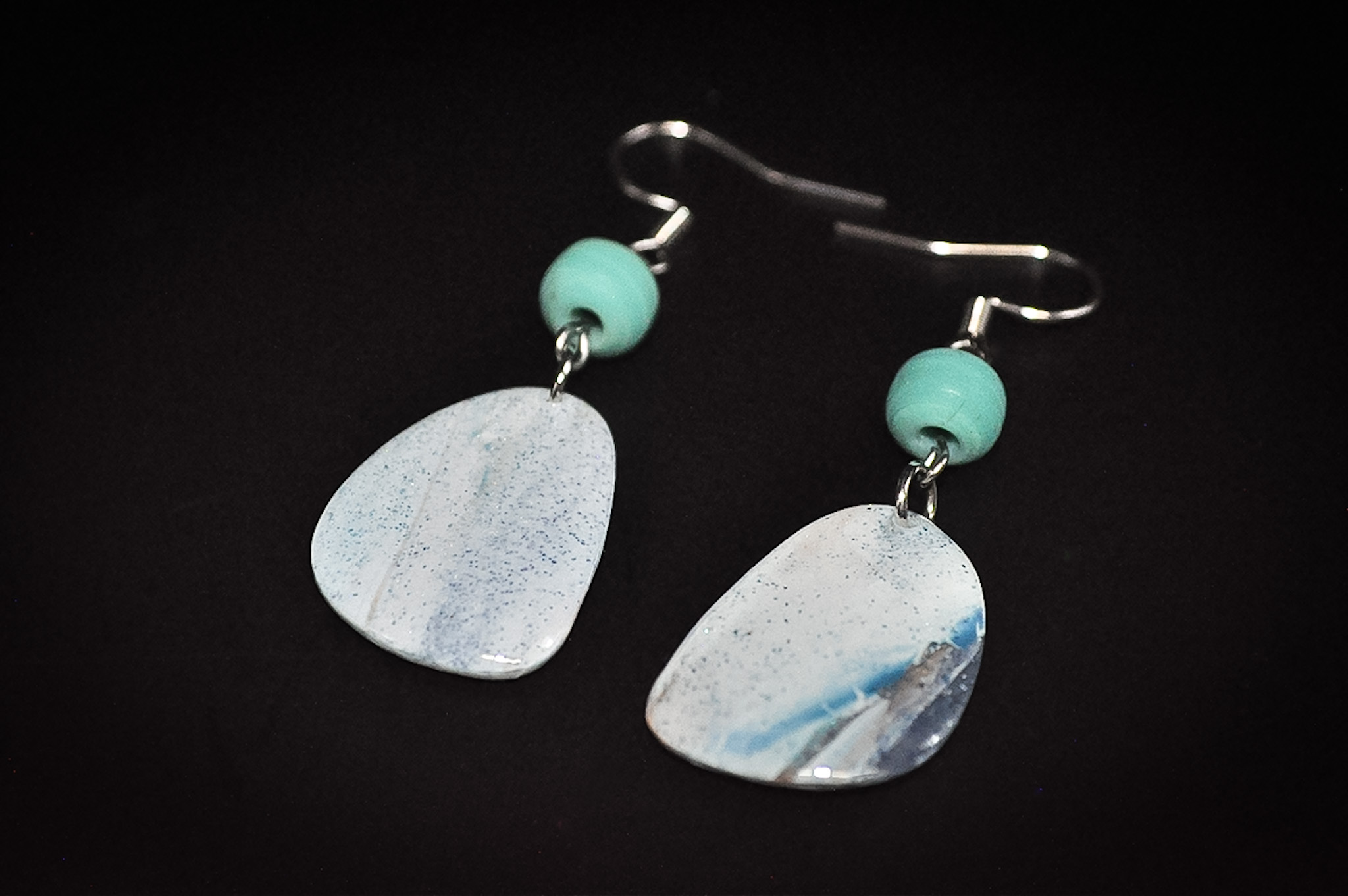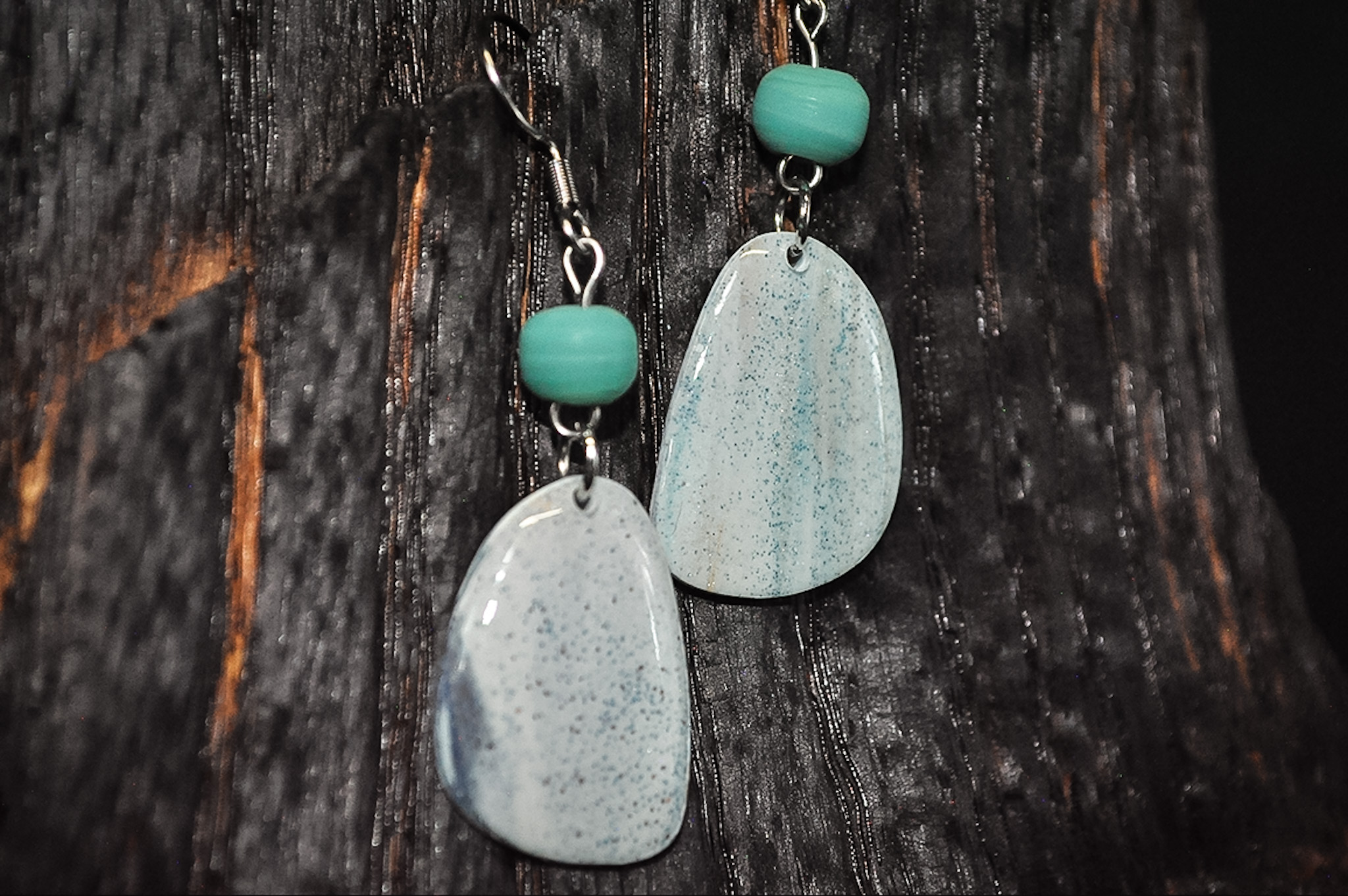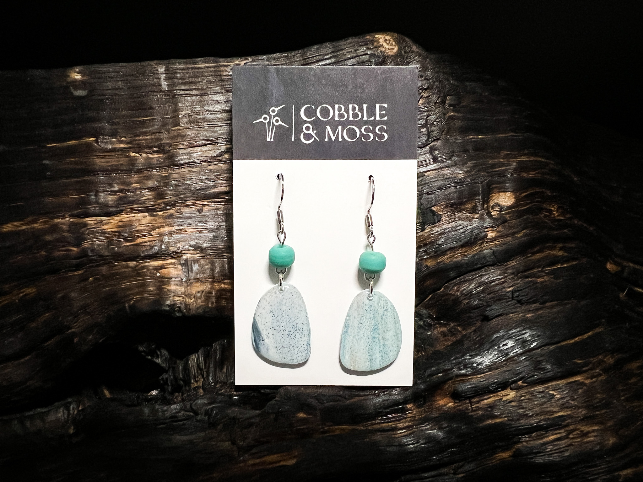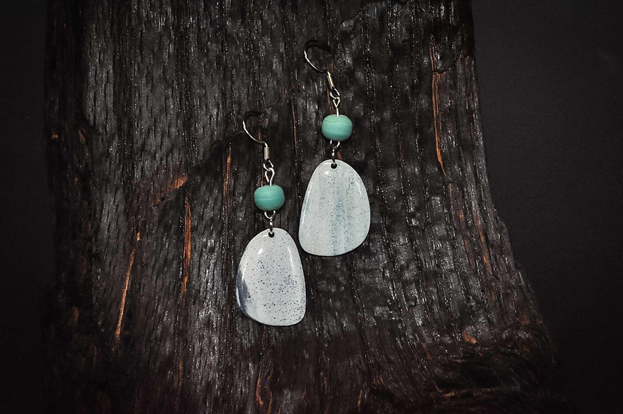 Materials: These pieces are handcrafted from premium polymer clay, uniquely textured with dark blue embossing powder to create a natural, granite-like speckled effect. Within the clay, we’ve integrated metallic shimmer and light tan streaks to replicate the mineral veins found in layered stone. Each earring is accented with a matte turquoise bead and finished with hypoallergenic French hooks.