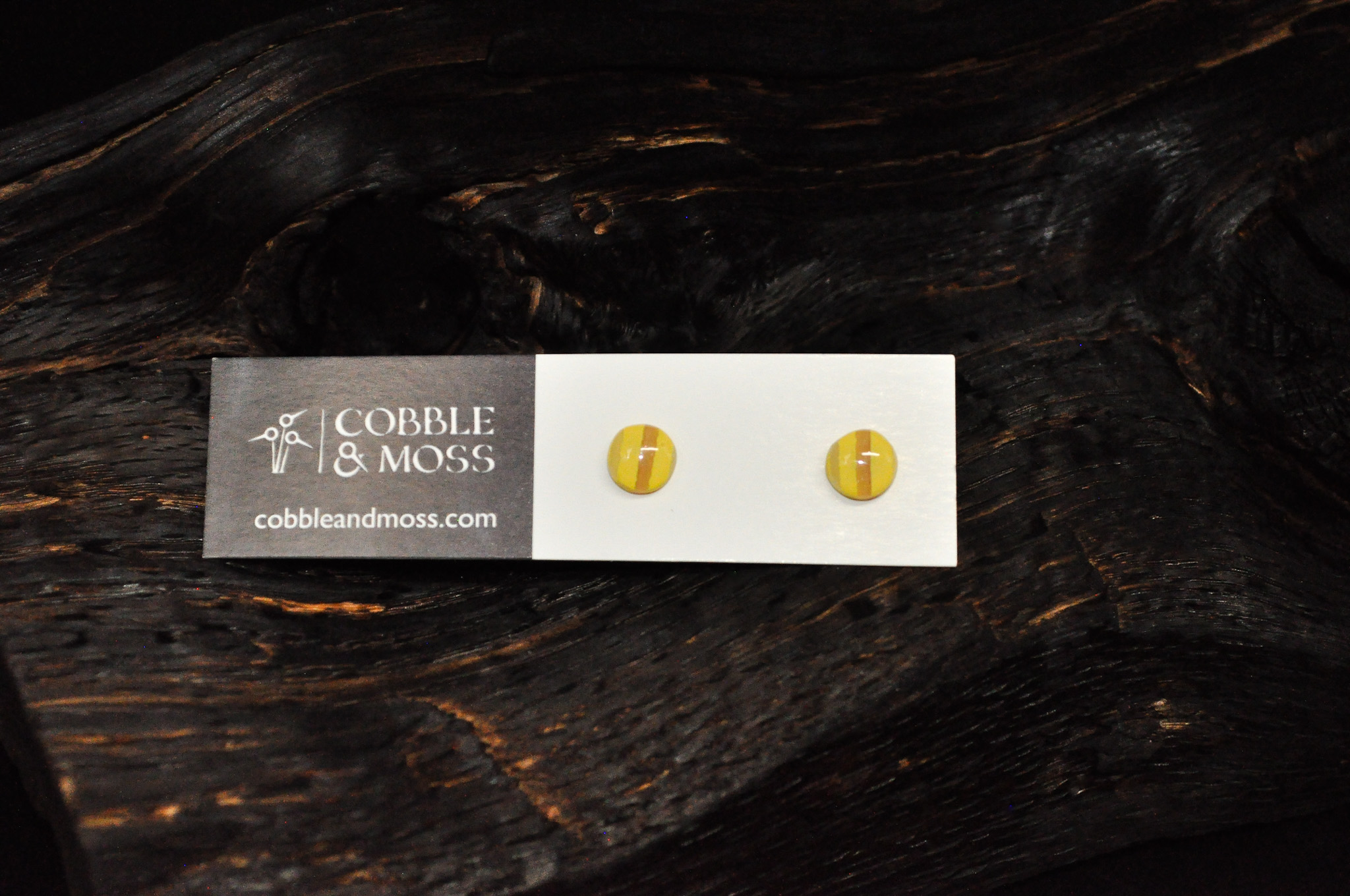The Look: Bright, airy, and classically chic. The rhythmic yellow and clear stripes offer a clean, geometric aesthetic that remains soft and playful. These studs are the perfect “pop of color” for a neutral outfit, adding a touch of nostalgic charm whether you’re heading to the office or meeting a friend for coffee. Because of the hand-layered process, each earring has its own unique “sugar-striped” personality.