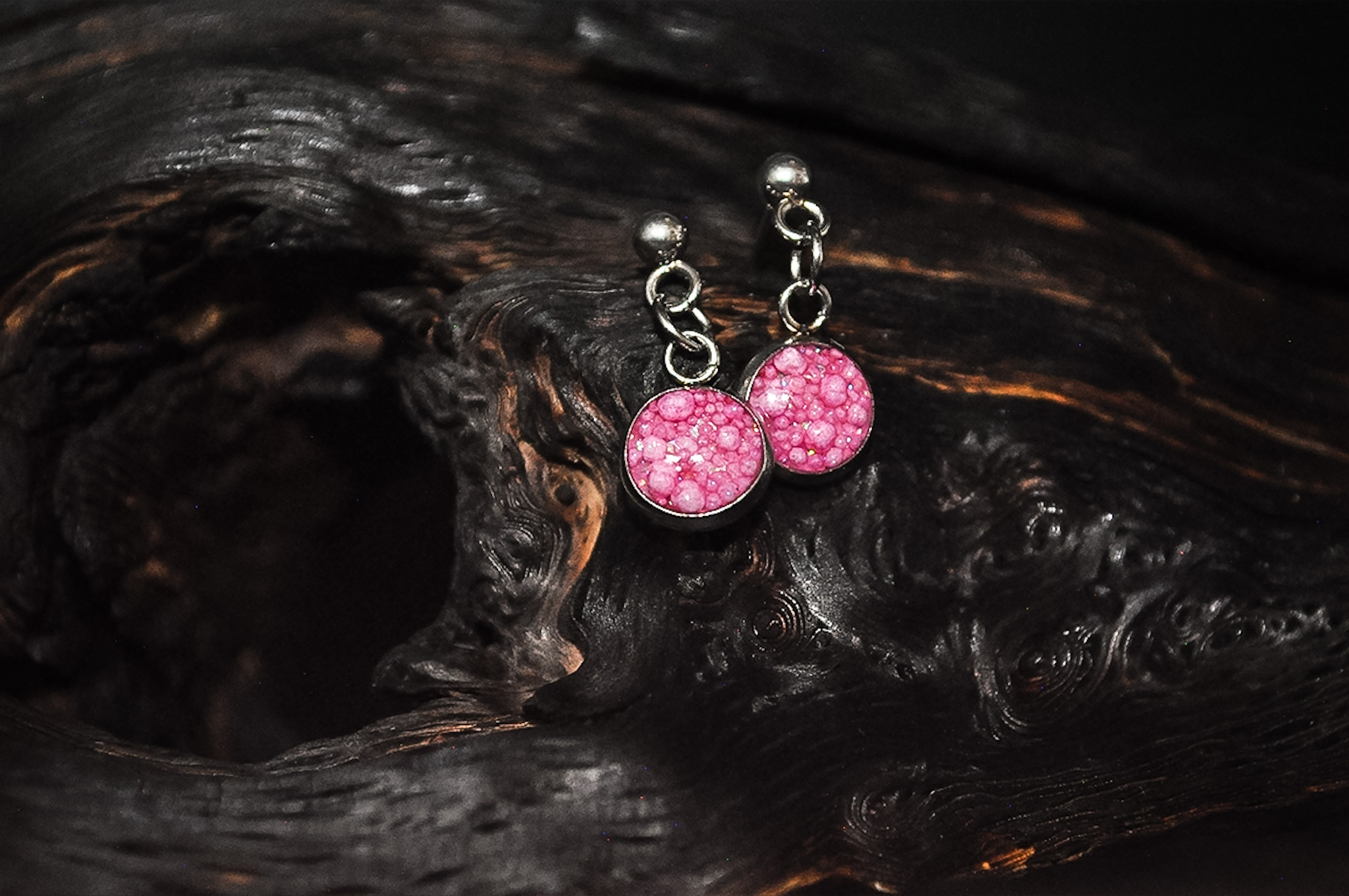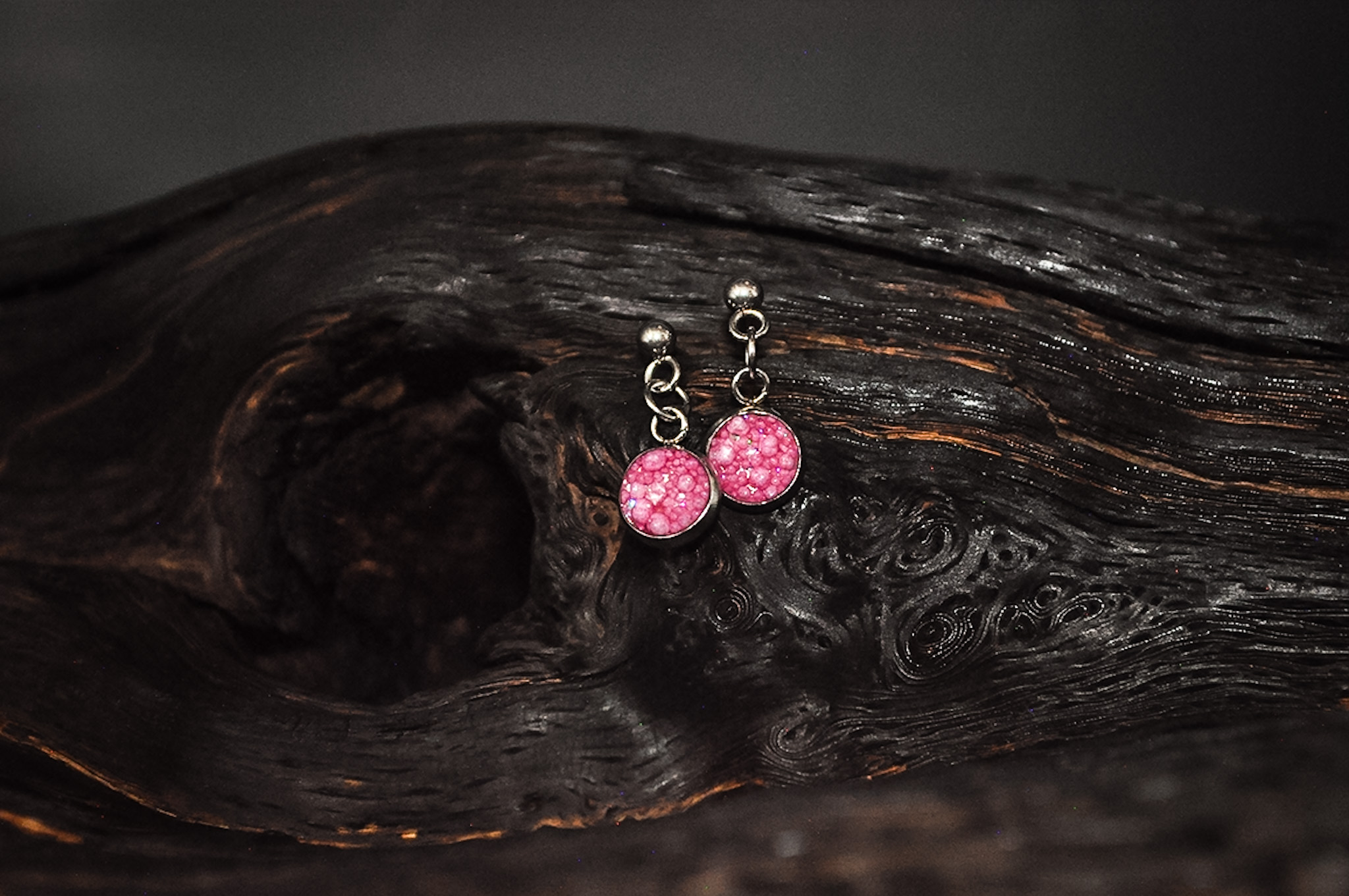Materials: This design brings a unique, three-dimensional depth to the collection. We have layered a base of vibrant pink glitter paper with assorted sizes of bubblegum pink glass spheres. These tiny glass accents are carefully set into a polished stainless steel bezel and encased in a high-clarity resin dome. The resin suspends the glass beads in a permanent mosaic, creating a beautiful, clustered effect that mimics the natural texture of a flower’s heart.