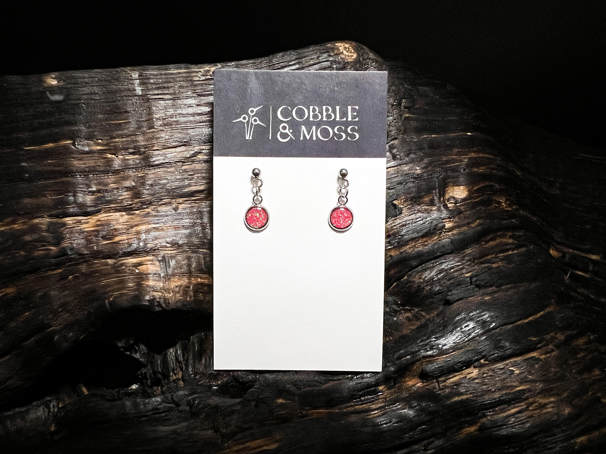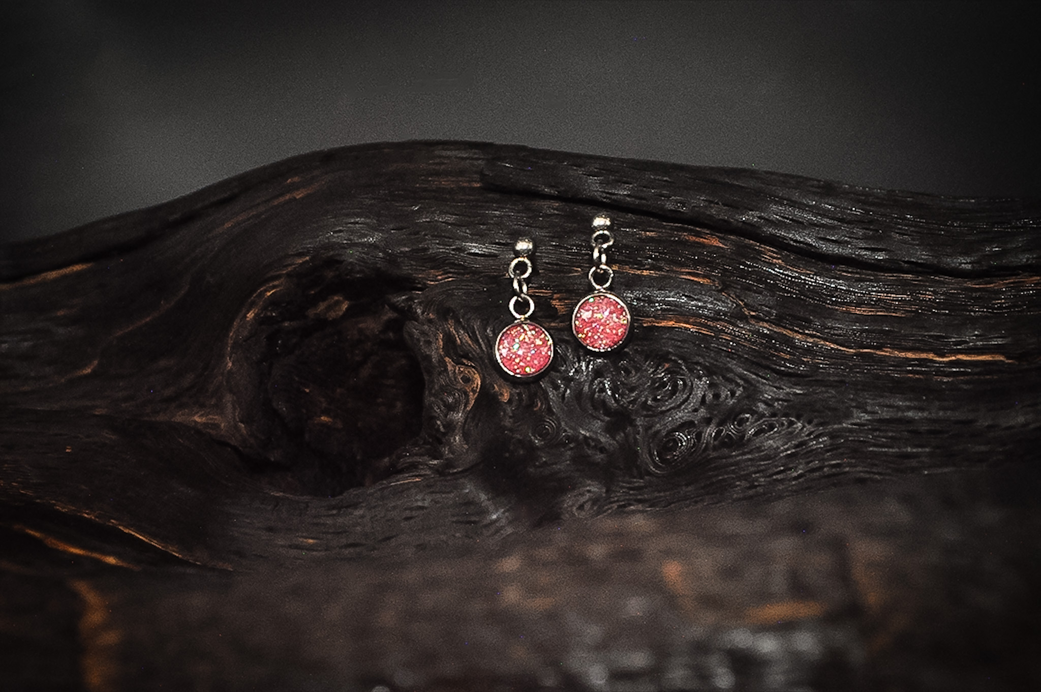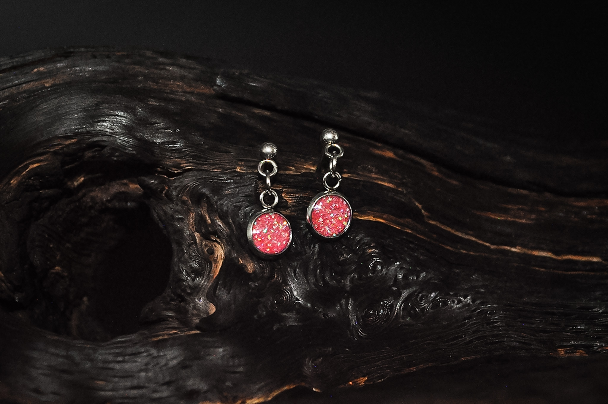 Materials: This design features a warm, orange-pink artisan paper base, providing a soft coral foundation. Overlaid on this base is a layer of fine iridescent glitter, which acts like tiny prisms to catch and reflect a spectrum of colors. These materials are set within a polished stainless steel bezel and protected by a hand-poured resin dome. The resin amplifies the iridescent flakes, giving the earrings a luminous, holographic depth.