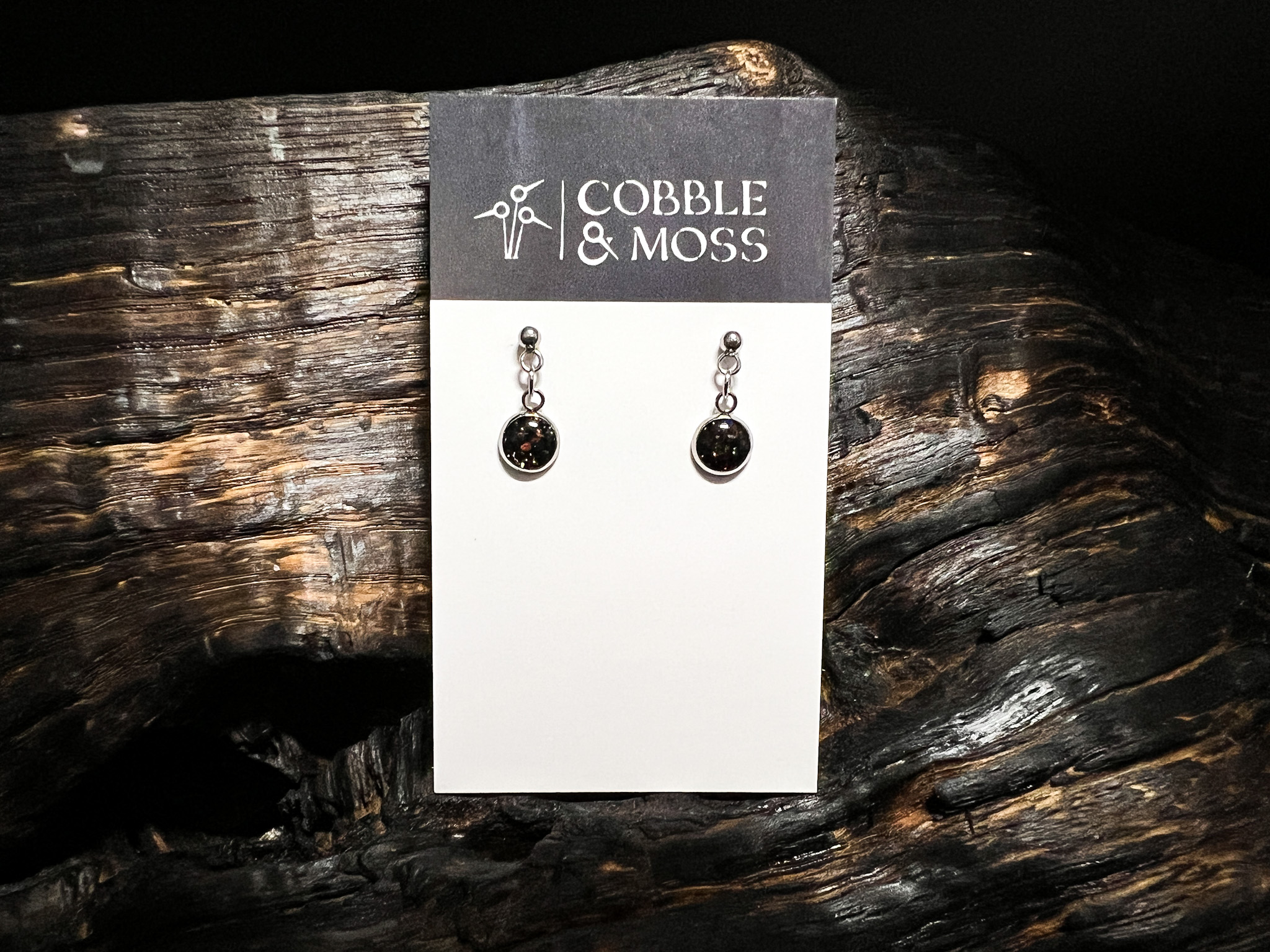 Inspired by the dark, textured stones of a moonlit trail, these earrings capture the quiet elegance of a midnight walk. Part of The Cobbled Curios collection, they represent a refined “Glimmer in the Glen”—the subtle, silver sparkle of dew or frost caught against the deep shadows of the forest floor.